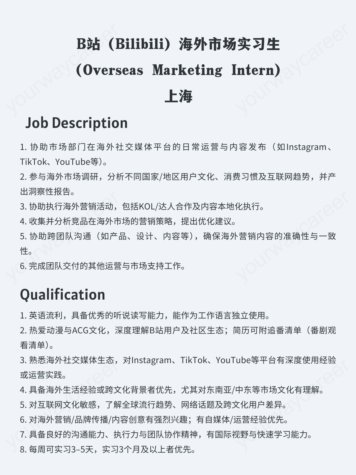 - 上海|B站(Bilibili)海外市场实习生(Overseas Marketing Intern)