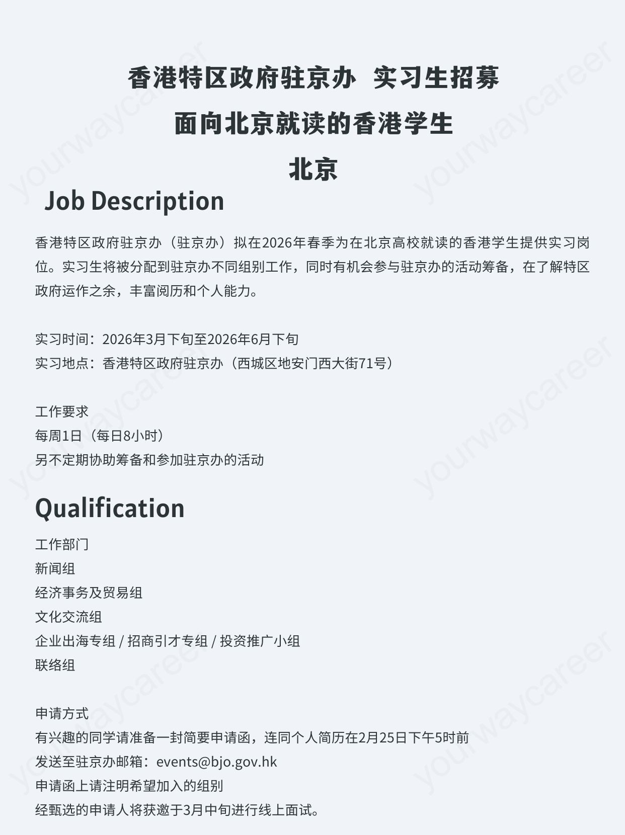 北京|香港特区政府驻京办 实习生招募 - 面向北京就读的香港学生