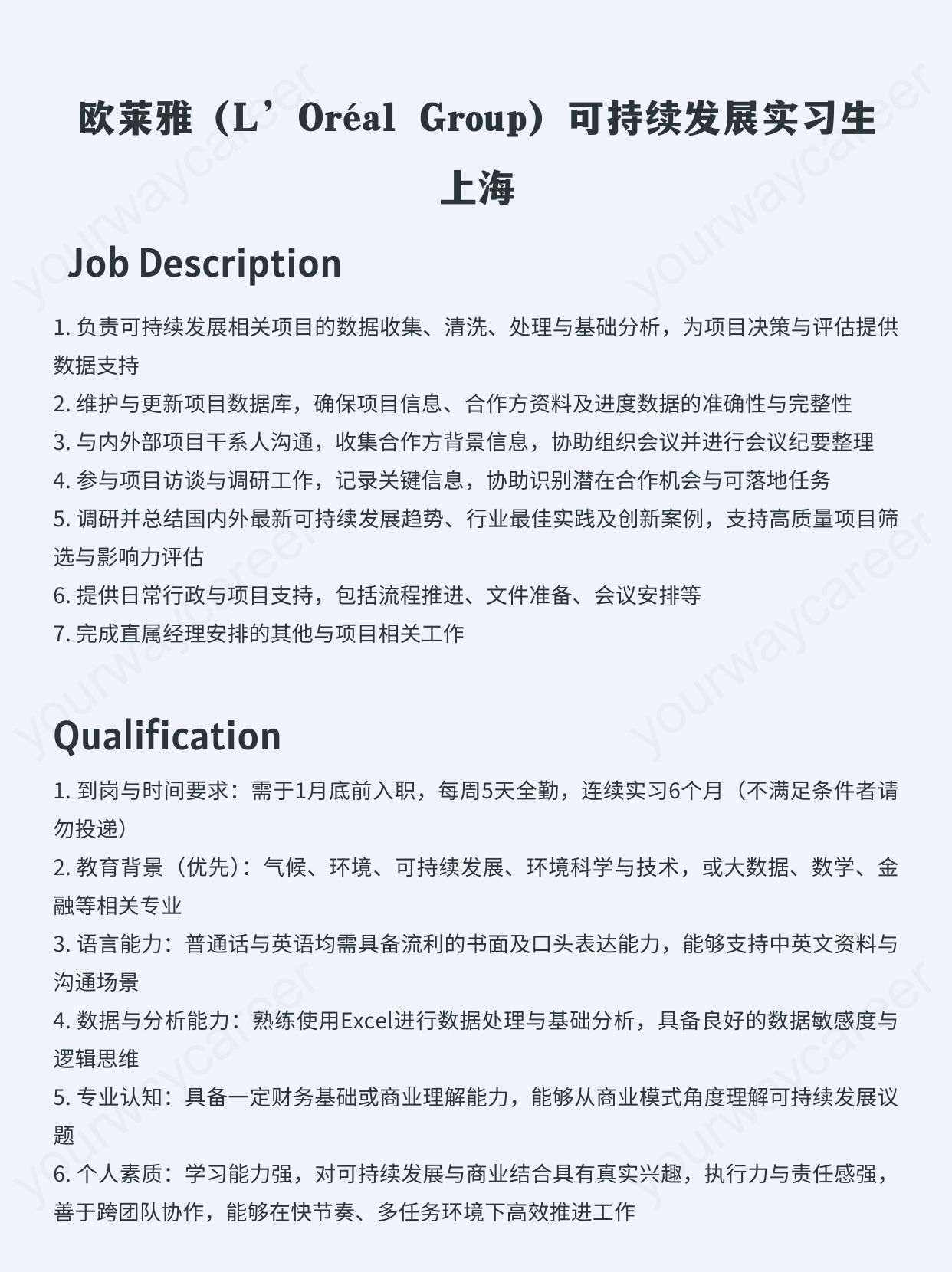 - 上海|欧莱雅集团(L’Oréal Group)可持续发展实习生