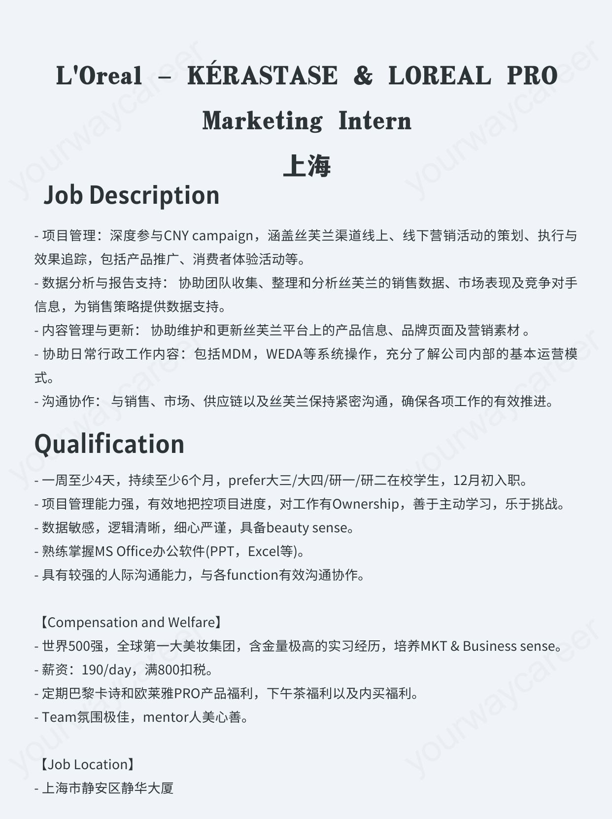 - 上海|L'Oreal – KÉRASTASE & LOREAL PRO Marketing Intern