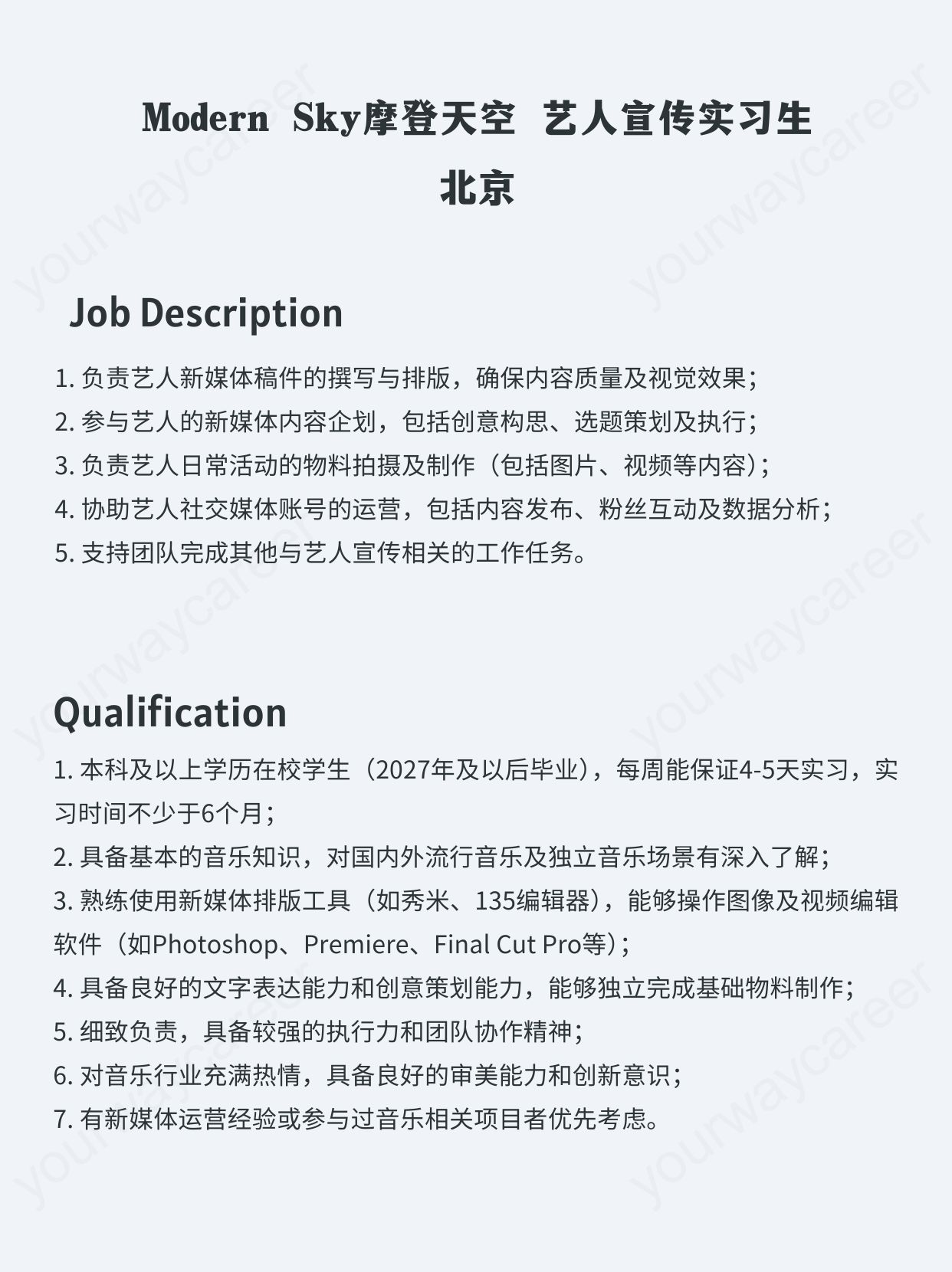 北京|Modern Sky摩登天空 艺人宣传实习生